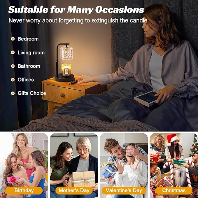 - Smart Timer Function - Never worry about leaving your candle warmer on again! With our innovative timer function, you can easily set the lamp for 2, 4, or 8 hours. This thoughtful feature lets you enjoy your favorite scents without the stress of remembering to turn it off, providing peace of mind while you sleep or go about your day. It’s a safer, more economical alternative to traditional candles, allowing you to focus on what truly matters.4.
