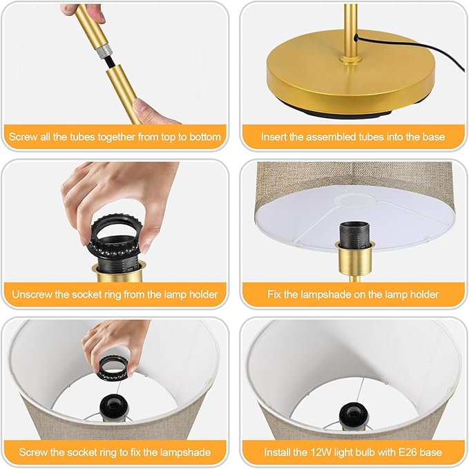 - 【Easy Assembly and premium quality】Made with a gold metal body and a linen lampshade, the vintage floor lamp is simply designed and look good in any surroundings; With a 6lb sturdy base, this 58-inch (5ft) in tall lamp stands steadily and won't tip over easily, which is safe for kids; Without tools required, you just need to screw all the parts together to finish the assembly of this standing lamp; PS. The assembly video is attached to the product page