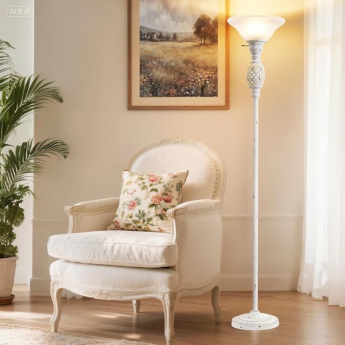 - Elegant Vintage Design: This 70-inch floor lamp combines mid-century style with modern function. Features a frosted glass shade and metal body with resin-carved night light housing in a classic white finish