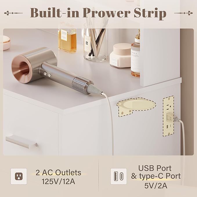 • Thoughtful and intelligent design Three open shelves on the desktop are convenient for storing commonly used skincare products, perfume and cosmetics, etc., which is more convenient to put in and out at hand. On the side of the table, there is a hair dryer holder and a built-in socket with two AC outlets, one usb port and one type-c port. You can charge your cell phone and other electronic devices while blowing your hair.
