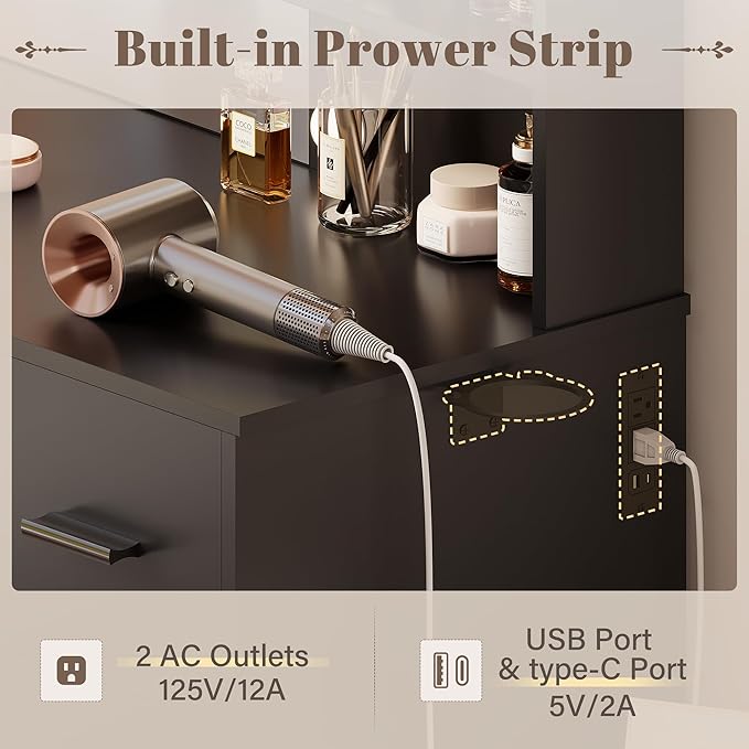 - Thoughtful and intelligent design Three open shelves on the desktop are convenient for storing commonly used skincare products, perfume and cosmetics, etc., which is more convenient to put in and out at hand. On the side of the table, there is a hair dryer holder and a built-in socket with two AC outlets, one usb port and one type-c port. You can charge your cell phone and other electronic devices while blowing your hair.