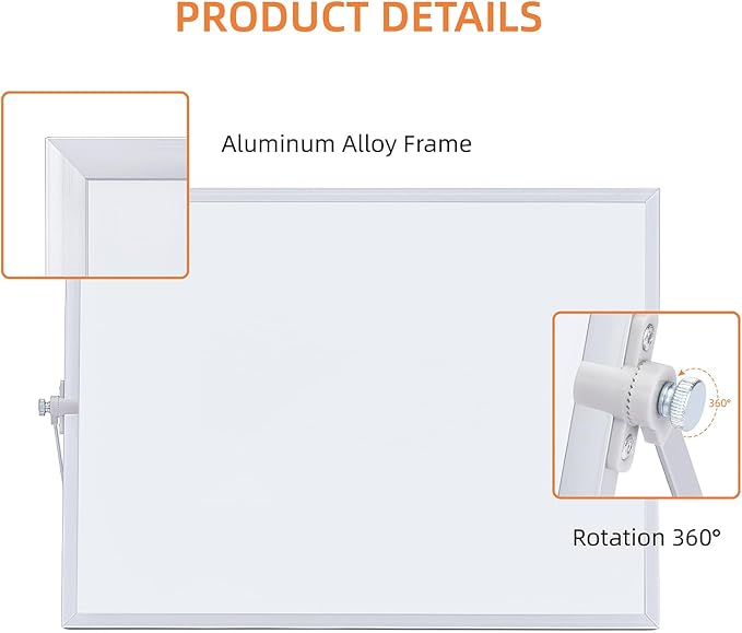 - This whiteboard measures 10 "x14" in size and features a sturdy aluminum alloy frame with a 360 ° rotating bracket for easy angle adjustment and comfortable use.