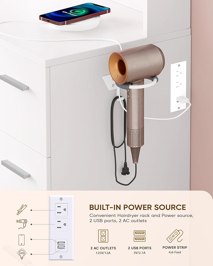 - 【POWER OUTLET & HAIRDRYER RACK】 LIVELYGLOW Makeup Vanity with lights include a built-in power outlet (With 2 AC outlets, 2 USB ports) convenient for charging your hair dryer, mobile phone and fill light, etc. And our vanity also equiped a hairdryer rack to keep your hairdryer.