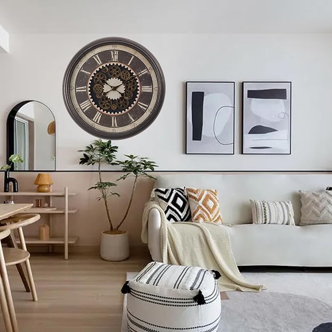 23 Inch Dark Brown Steampunk Wall Clock with Decorative Gears, Industrial Vintage Analog Clock for Living Room, Farmhouse, Office Decor, Silent Non-Ticking Battery Operated