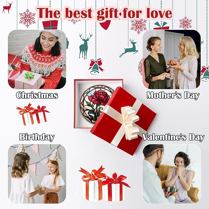 Stained Glass Window Hanging - Red Carnation Birth Flower Sun Catcher for Door Garden Home Decor Suncatcher Christmas Mother's Day Birthday Gifts for Women Men Mom Nana Friend Wife 6.3 in