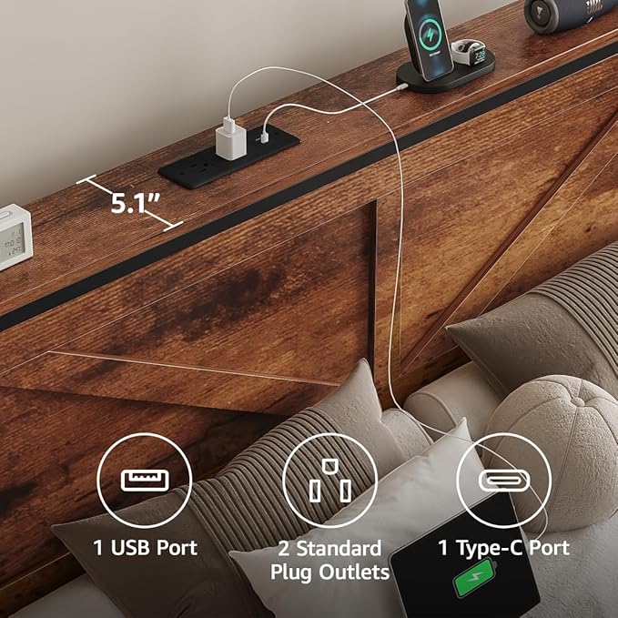 - Practical Headboard: Skip the bulky nightstand—this 5.1" wide headboard shelf keeps your essentials close at hand and your devices charged. With built-in USB and Type-C ports, you can power up while you relax. Convenient, clutter-free, and made for modern living