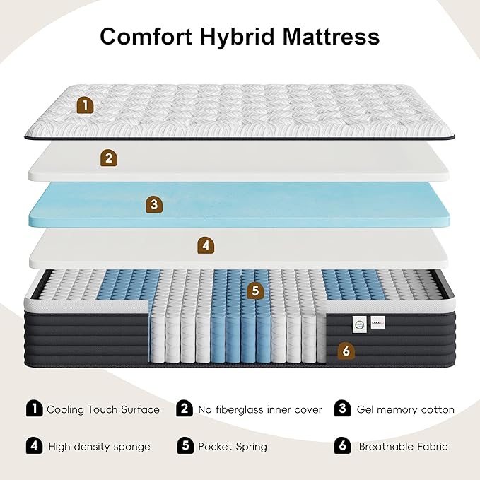 - Reinforced Spring for Better Support - COOLMI hybrid mattress queen is built with high-density memory foam and hundreds of independent pocket springs. A customized support for every curve of your body, ensuring that your weight is evenly distributed from head to toe. This ergonomic design maintains a good balance of your spine and ultimate pressure relief, give a better protection to you and your family.
