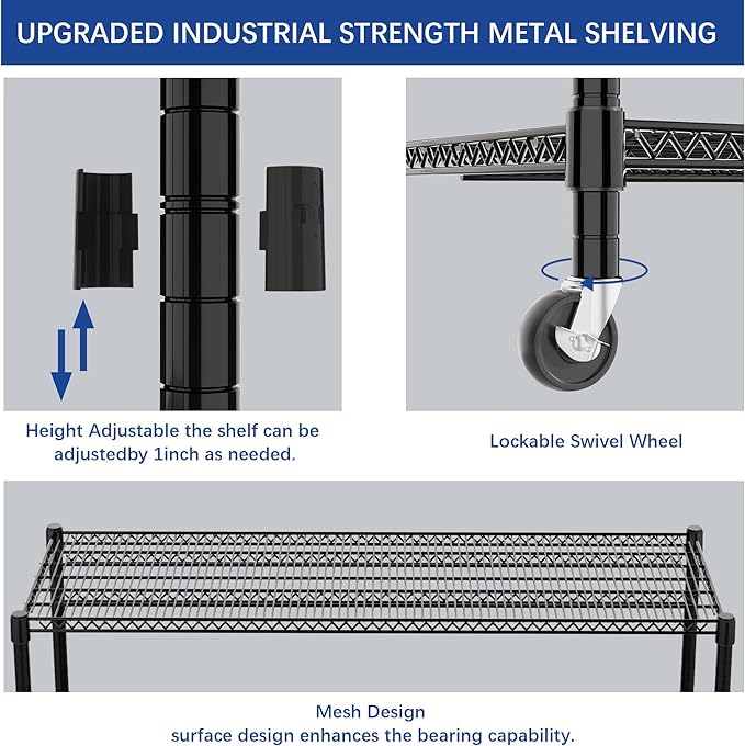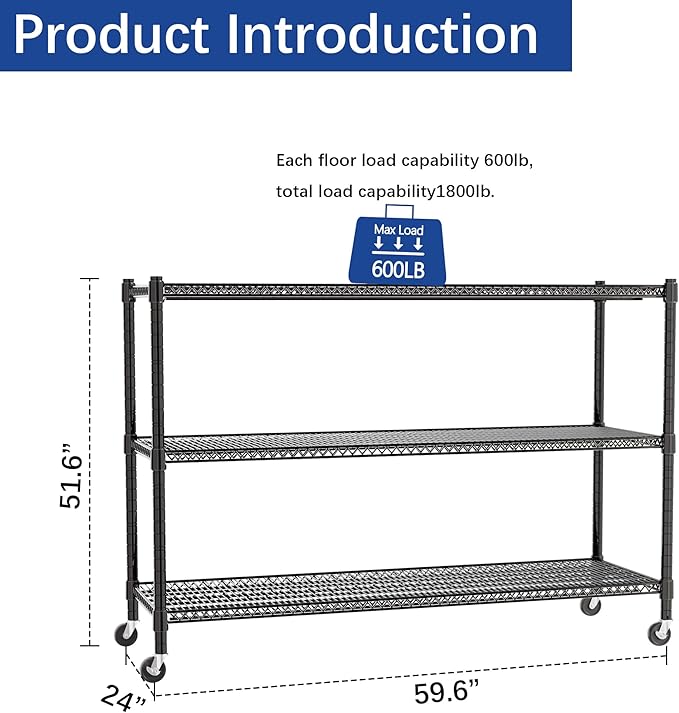 - SMART STORAGE: Adjustable wire shelves perfect size(24"Dx59.6"Wx47.6"H).The storage shelves provide an enormous amount of space for you. The storage shelves can be placed in kitchens,bathrooms,rooms,living rooms,warehouses,offices,industrial,commercial exhibitions,hotels,etc.