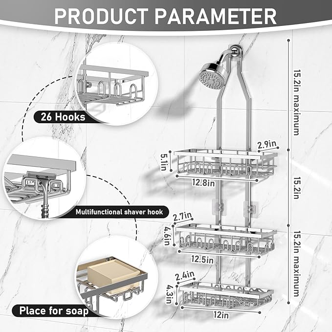 Shower Caddy,Rustproof Shower Shelves Over Shower Head,Triple Adjustable Storage,Silver