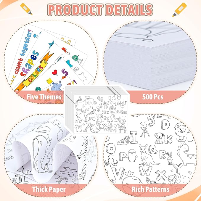 - 【Colorful Table Fun】You will receive 500 pieces of disposable paper placemats for children, including 100 pieces of weather counting doodle placemats, 100 pieces of pattern recognition doodle placemats, 100 pieces of color recognition doodle placemats, 100 pieces of pattern counting doodle placemats and 100 pieces of animal letter doodle placemats, which are enough to meet your daily use and replacement needs.