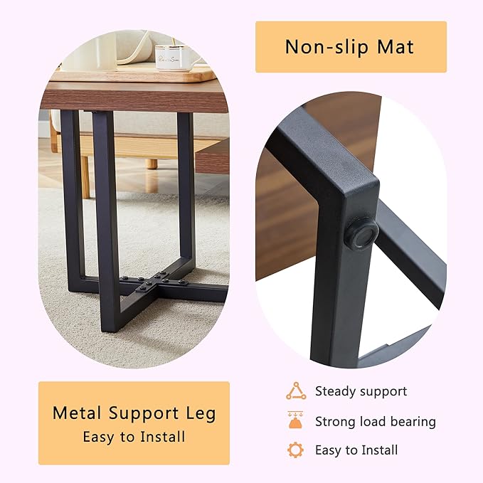 - Walnut color is suitable for a variety of spaces:Modern coffee table measures 47“ L x 23.5” W x 18" H. The wood surface features a rich walnut finish with sleek black metal legs, perfect for an apartment or living room.