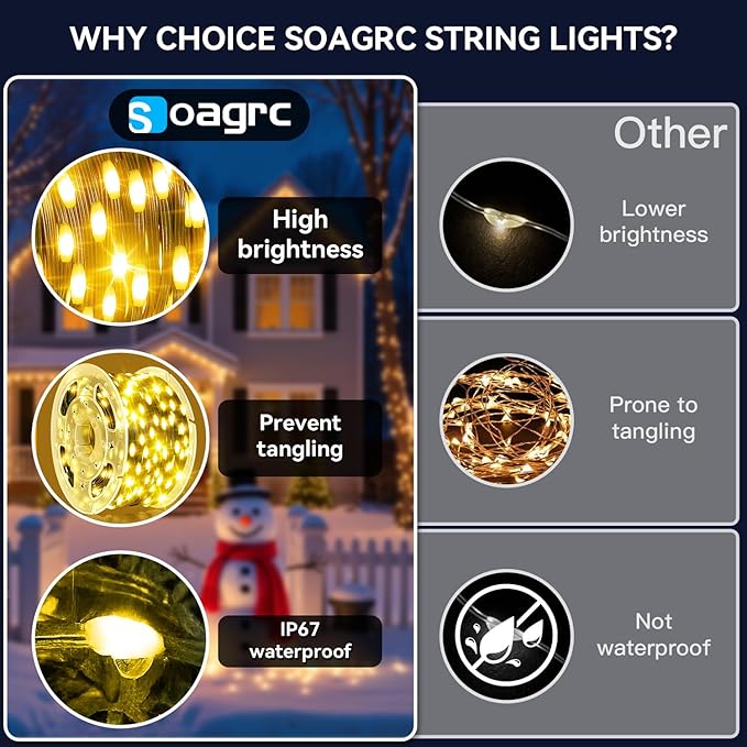 - 3 Timer Options & 4 Brightness Levels – Set your LED Christmas string lights just the way you like with 3 timer modes—6H, 8H, or a unique cycle timer (6H+6H+3H+9H)—for fully automated operation. Adjust the brightness to 20%, 50%, 75%, or 100% to create the perfect ambiance for any setting. Soagrc color changing string lights offer easier control for your holiday lights decoration both indoors and outdoors.