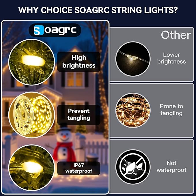 - 3 Timer Options & 4 Brightness Levels – Set your LED Christmas string lights just the way you like with 3 timer modes—6H, 8H, or a unique cycle timer (6H+6H+3H+9H)—for fully automated operation. Adjust the brightness to 20%, 50%, 75%, or 100% to create the perfect ambiance for any setting. Soagrc color changing string lights offer easier control for your holiday lights decoration both indoors and outdoors.