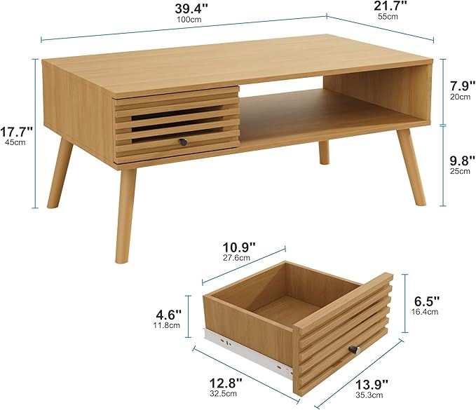 - 【Mid-century Modern Design】- This coffee table beautifully blends vintage charm with contemporary design. Featuring slatted drawer in a vintage color finish, it brings both elegance and cozy warmth to any space. More than just practical storage, it's a stylish statement piece that elevates living rooms
