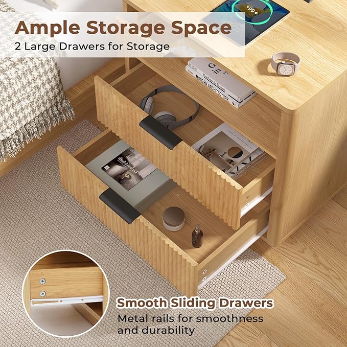 - 【Convenient Charging Station】Our fluted nightstand featuring a built-in charging station. Equipped with 2 USB ports and 2 AC power outlets, it ensures your devices are always charged and ready to go. The back panel includes a cable management hole, keeping your space neat and organized. This smart design not only saves time but also enhances the tidiness and comfort of the bedroom. It's the perfect companion for modern living.