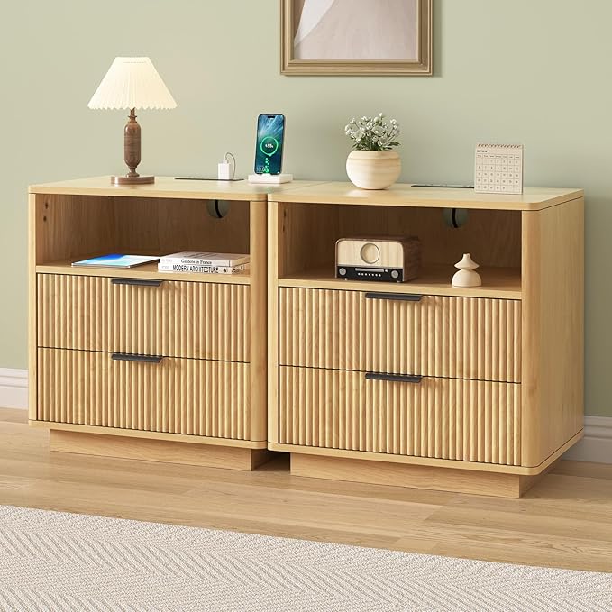 Hommpa 24'' Fluted Nightstand Set of 2 with Charging Station, Modern Bedside Table with Storage, 2 Drawer Beside End Table with Open Shelf, Mid Century Modern Wood Night Stand for Bedroom, Living Room