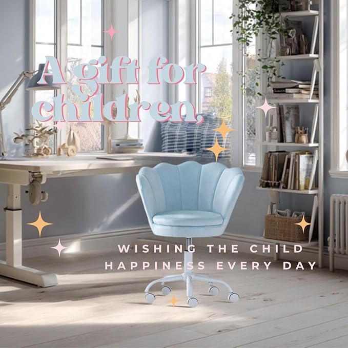 Velvet Desk Chair for Kids 8-12 Teen Room with Wheels, Upholstered Adjustable Children Computer Chair Comfy Rolling Study Armchair 360° Swivel Back and Arms for Teen Girls or Boys Bedroom, Blue