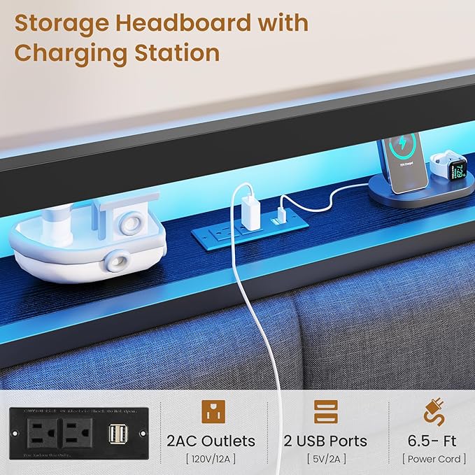 - Storage Headboard with Charging Station - 2 AC outlets and 2 USB ports, making it easy to enjoy the convenience of instant charging at your bedside. Spacious space can place commonly used items such as books, phones, alarm clocks, etc