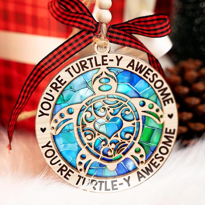 - PREMIUM 2 LAYERED MIX (WOOD + ACRYLIC) CRAFTSMANSHIP - Expertly crafted from durable wood and dazzling acrylic, this turtle Christmas ornament merges with beauty with refined clarity. Enjoy lasting quality and vivid sea turtle designs, ensuring your ornament remains a treasured part of your beachy Christmas ornaments and turtle decor collection through many holiday seasons.