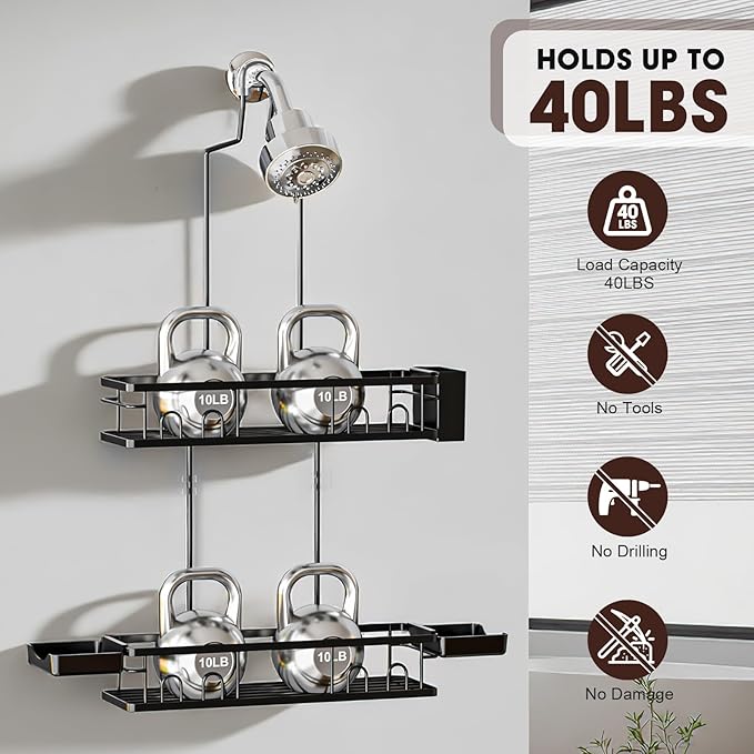- 40LB Strong Load-Bearing: The bathroom organizer with 2 tier basket, including 8 hooks on the side, 4 removable hooks, 2 soap dishes and a razor holder, can hold up to 40lbs of toiletries. It maximizes the use of space in your bathroom, inside shower stall or bath tub. You can place shampoo gel, conditioner, body wash, bar soap and other shower toiletry stuff, it can meet almost all your shower storage needs and keep your toiletries organized.
