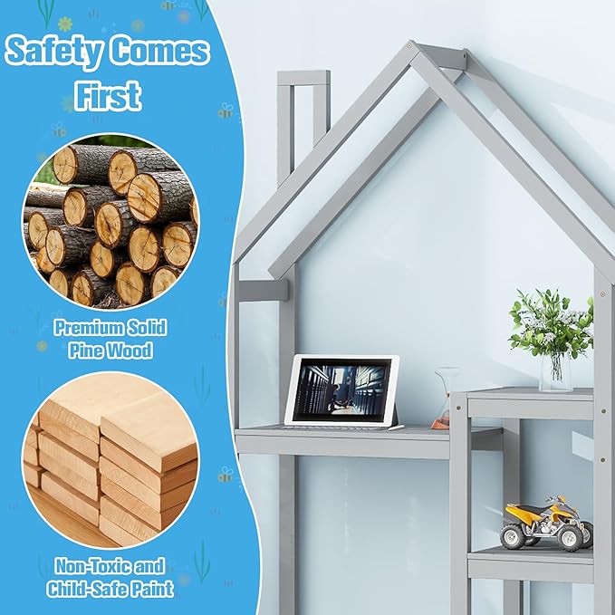 2-in-1 Kids Writing Desk and Bookshelf, 72 inch Tall House-Shaped Wooden Desk for Kids, Built-in 3-Tier Storage Shelves, Anti-Tipping Device, Ideal for Bedroom, Playroom, Learning (Grey)