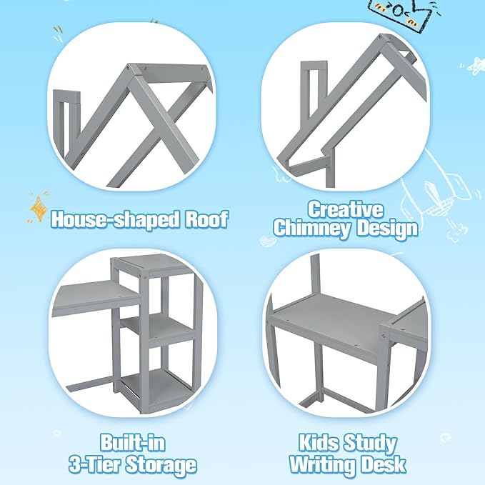 - 【House-Inspired Design with Storage Functionality】This kids' writing desk combines playful aesthetics with practicality. Shaped like a house, the 72.4-inch tall frame offers a cozy and imaginative workspace. The built-in 3-tier side shelf allows kids to organize books, toys, and supplies within reach, keeping the desk neat and functional.
