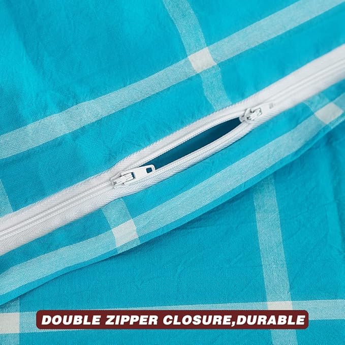 FACE TWO FACE Bedding Duvet Cover Set100% Washed Cotton Duvet Cover Linen Like Textured Breathable Durable Soft Comfy (King, Turquoise Grid)