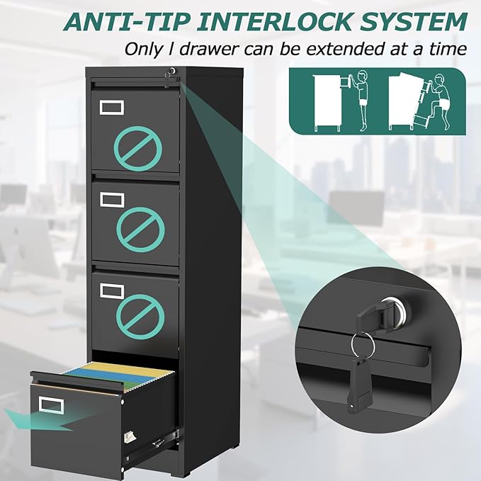 GREATMEET 4 Drawer File Cabinet with Lock, Small Metal File Cabinets for Home Office 4 Drawer, Black Vertical Filing Cabinets for Letter/Legal/A4/F4 Size File,Assembly Require