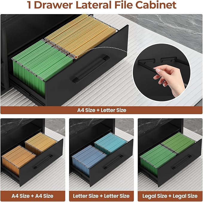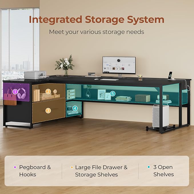 - 【Ample Storage Space】The decent layout L shaped computer desk provides a variety of storage space, including a lagre file drawer, CPU stand, printer space, pegboard, storage shelves and hooks. The larger file drawer is ideal for Letter ,Legal and A4 size documents, and the open storage shelves can store your frequently used documents, books, or display item.