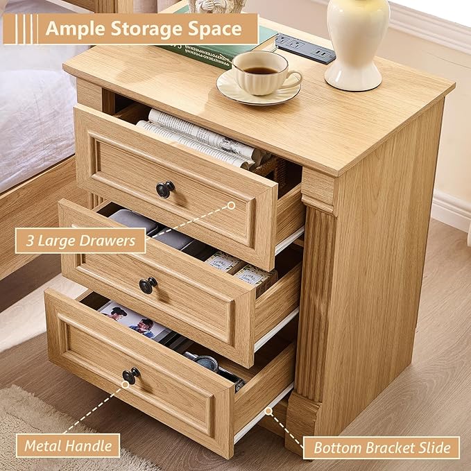- NIGHTSTAND DIMENSIONS: 26" H x 15.5" L x 23.6" W, 3 Large Drawers Dimensions: 3.78" H x 11.8" L x 16.5" W, Each drawer provides ample room for your essentials, from widget and accessories to books and gadgets, ensuring a clutter-free environment. The nightstand’s classic farmhouse design, combined with the practicality of three large drawers, offers both elegance and functionality, making it a perfect addition to any bedroom decor