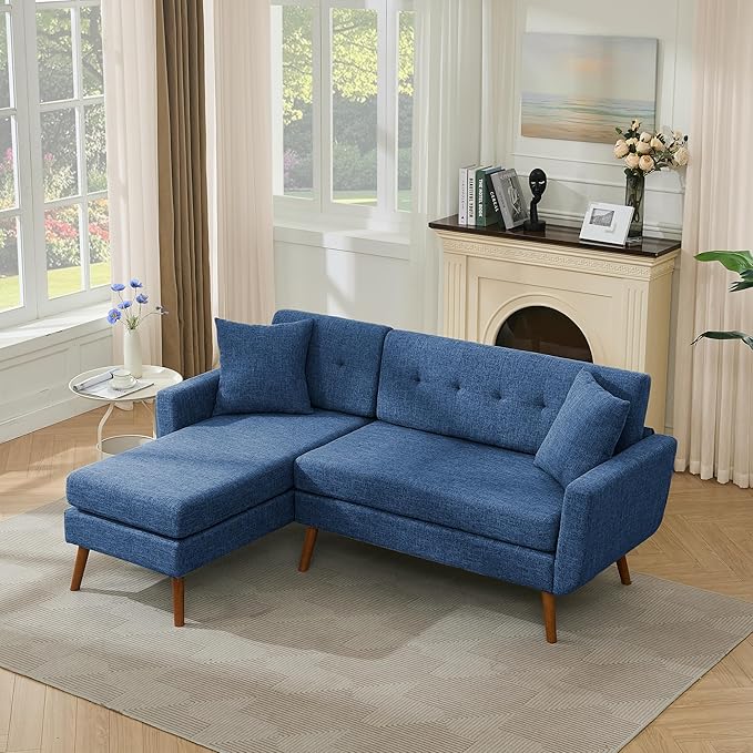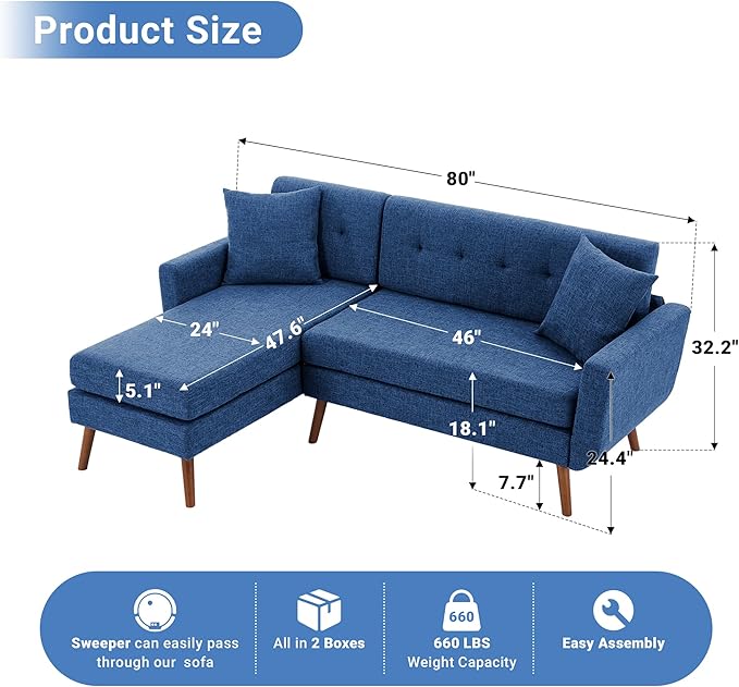 Tbfit L Shaped Couch Sofa, 80" W Mid-Century Modern Sectional Couches, 3 Seater Sofas with Wide Chaise Lounge & Two Pillows,Button Tufted Upholstered Sectional Sofa for Living Room, Bedroom, Blue