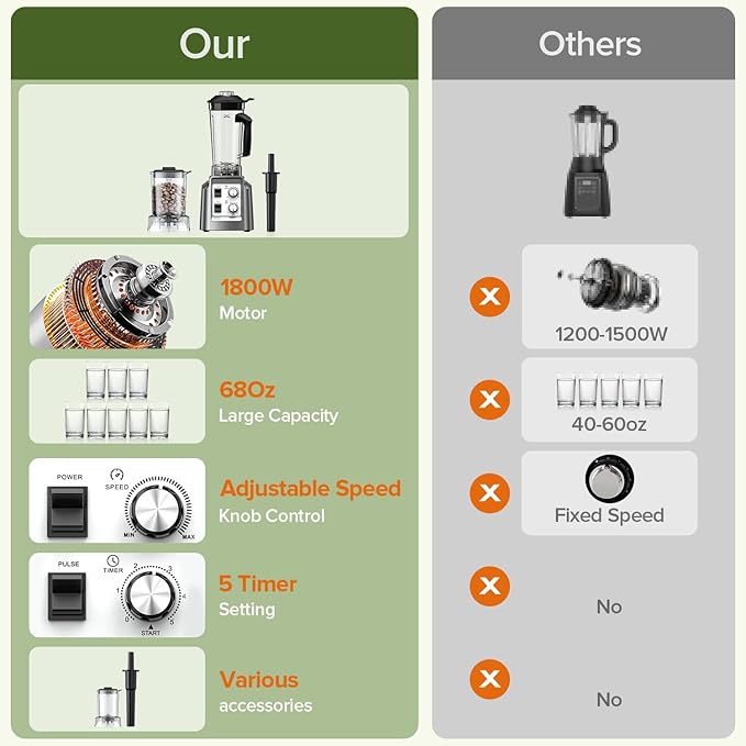 - 【1800W Motor】- Crush ice, blend tough ingredients, and craft smoothies in seconds with a professional 1800W motor. Built for heavy-duty kitchen tasks.
