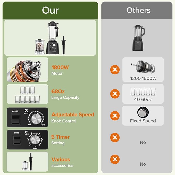 - Ultra-Powerful Motor & Blades: Features a robust 1800W motor reaching 28,000 RPM and durable 3D stainless steel blades, effortlessly crushing ice, frozen fruits, nuts, and tough ingredients.
