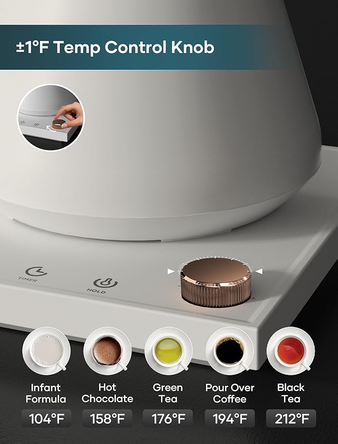 • ±1℉ Precise Temperature Control - The intelligent base of this gooseneck electric kettle auto-adjusts heating power for pinpoint accuracy. From pour-over coffee at 205°F to green tea at 176°F, enjoy barista-quality flavor every time.