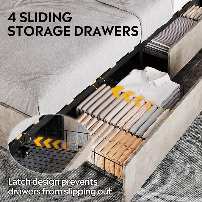 - 【Large Capacity Storage】 Equipped with four hidden drawers (26.9"L × 15.8"W), offering ample space for bedding, accessories, and off-season clothing—saving space and keeping your bedroom tidy. Each drawer is equipped with four smooth-gliding rollers for effortless opening and closing, while the locking mechanism prevents the drawer from sliding out.