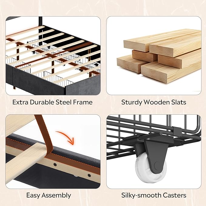 - 【Large Capacity Storage】 Equipped with four hidden drawers (26.9"L × 15.8"W), offering ample space for bedding, accessories, and off-season clothing—saving space and keeping your bedroom tidy. Each drawer is equipped with four smooth-gliding rollers for effortless opening and closing, while the locking mechanism prevents the drawer from sliding out.