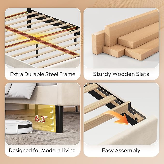 - 【No Box Spring Needed】 Designed with strong wood slats support, this bed frame requires no box spring—stable, durable, and cost-saving.