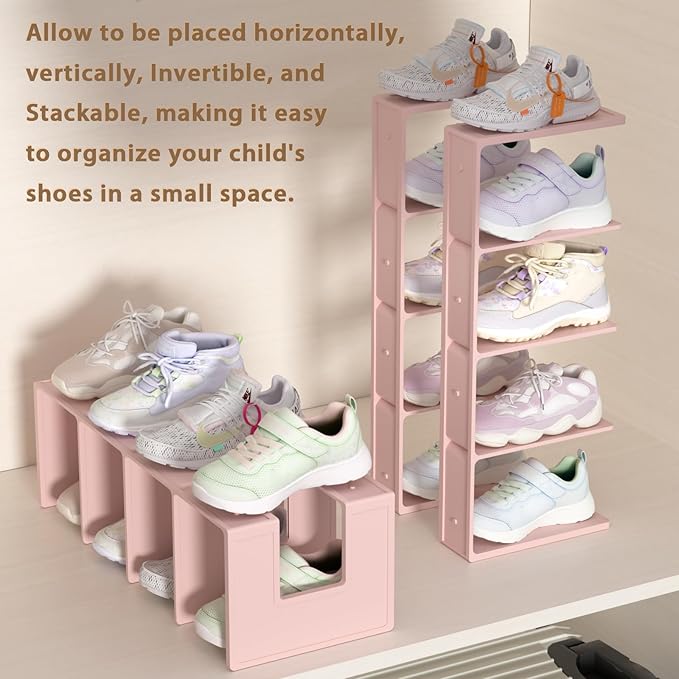 - Flexibly Placement to Fit Your Space - The small shoe rack organizer allows for horizontal, vertical, Invertible, and stackable placement, perfect fit any closet, making it easy to organize your child's shoes in a small space.