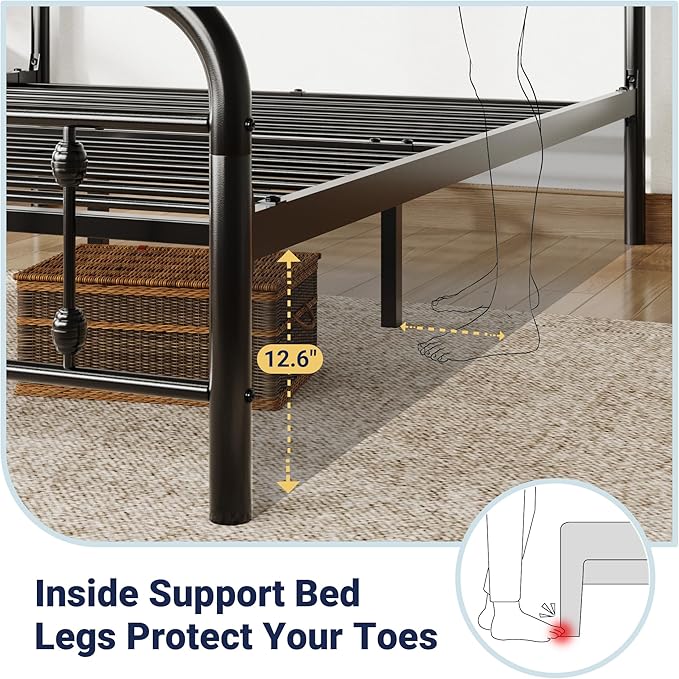 - Elevated and Secure: This classic metal bed features a tall headboard and footboard with smooth, curved corners for comfortable lounging and added safety. The sturdy frame keeps your mattress firmly in place, while strategically placed inner legs and non-scratch footpads protect floorsโand toes