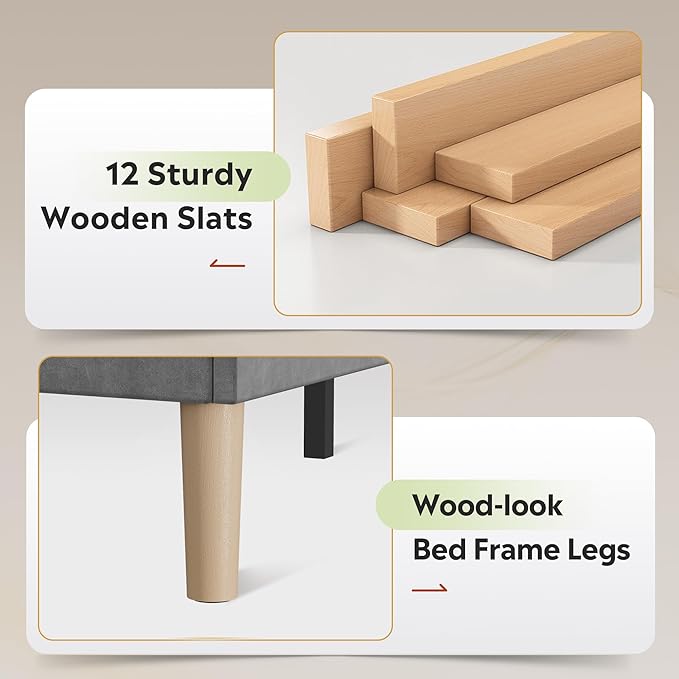 - 【Premium Elegant Upholstered Design】 Upholstered in premium velvet fabric with high-density foam padding for a soft, comfortable feel; tufted headboard design adds a touch of elegance to any bedroom. Features faux wood bed frame legs with a realistic wood-grain finish, blending seamlessly with any room.