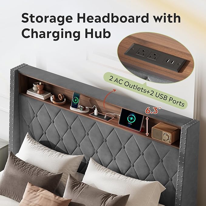 - 【Headboard Storage Shelf with Multi-Port Charging】 The headboard features a single storage shelf perfect for glasses, phones, and remotes. It comes equipped with 2 USB ports and 2 AC outlets allowing convenient fast charging of multiple devices.