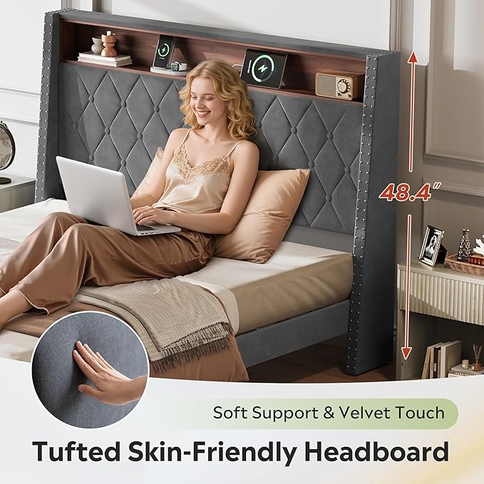 WLIVE Queen Size Upholstered Bed Frame with Storage Headboard, Velvet Square Tufted Platform Bed with Charging Station, Sturdy Metal & Wooden Slats Support, No Box Spring Needed, Grey