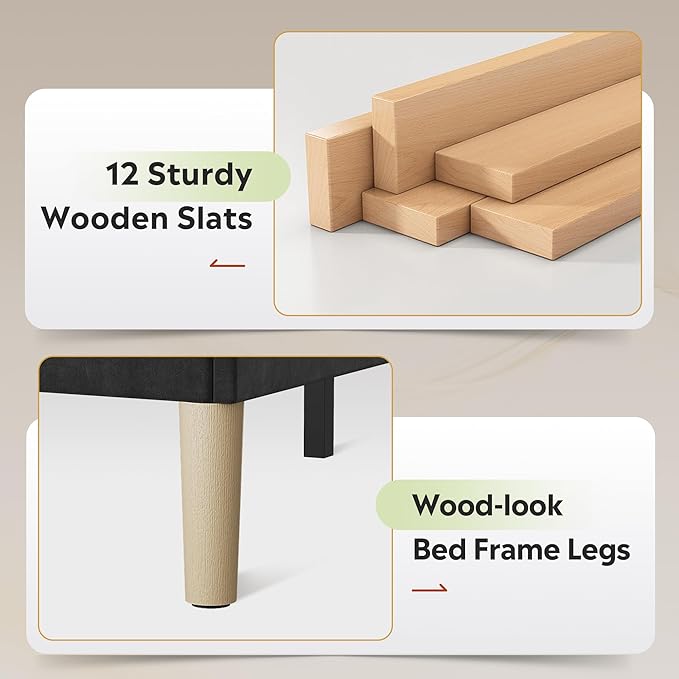 - 【Premium Elegant Upholstered Design】 Upholstered in premium velvet fabric with high-density foam padding for a soft, comfortable feel; tufted headboard design adds a touch of elegance to any bedroom. Features faux wood bed frame legs with a realistic wood-grain finish, blending seamlessly with any room.