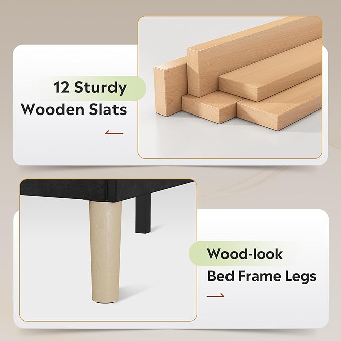 - 【Sturdy & Noise-Free Structure】 Heavy-duty metal frame paired with 12 thickened solid wood slats provides even support, prevents sagging, supports up to 1500 lbs, and ensures a quiet, squeak-free sleep.