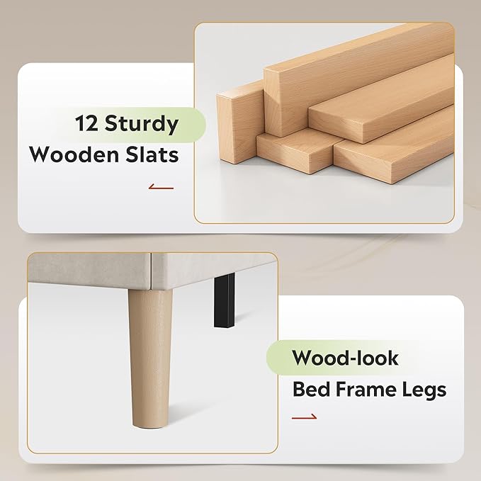 - 【Sturdy & Noise-Free Structure】 Heavy-duty metal frame paired with 12 thickened solid wood slats provides even support, prevents sagging, supports up to 1500 lbs, and ensures a quiet, squeak-free sleep.