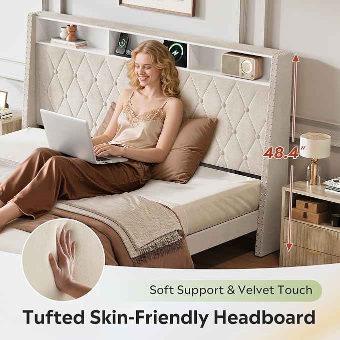 WLIVE King Size Upholstered Bed Frame with Storage Headboard, Velvet Square Tufted Platform Bed with Charging Station, Sturdy Metal & Wooden Slats Support, No Box Spring Needed, Beige