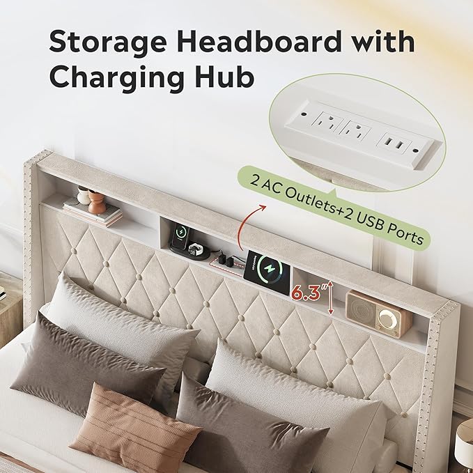 - 【Headboard Storage Shelf with Multi-Port Charging】 The headboard features a single storage shelf perfect for glasses, phones, and remotes. It comes equipped with 2 USB ports and 2 AC outlets allowing convenient fast charging of multiple devices.