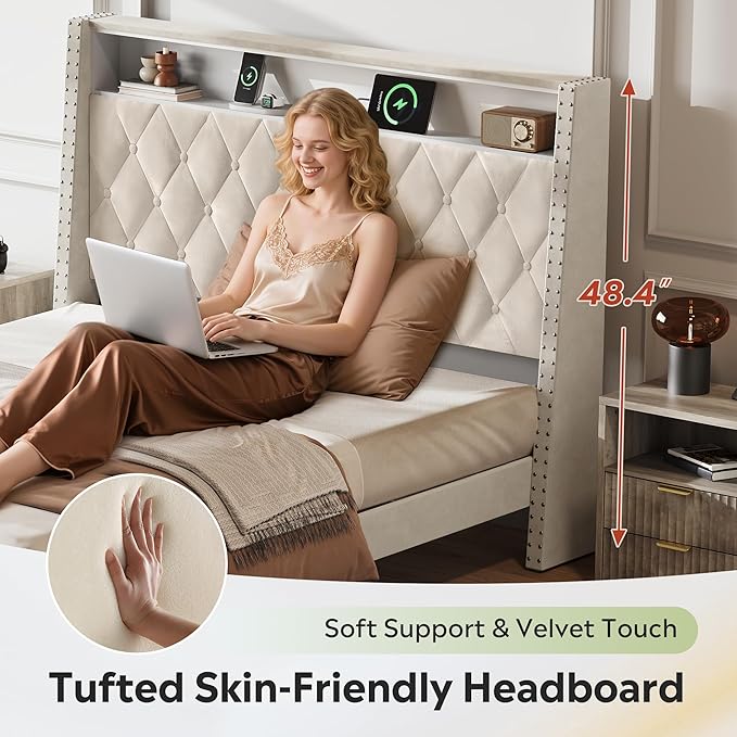 WLIVE Queen Size Upholstered Bed Frame with Storage Headboard, Velvet Square Tufted Platform Bed with Charging Station, Sturdy Metal & Wooden Slats Support, No Box Spring Needed, Beige