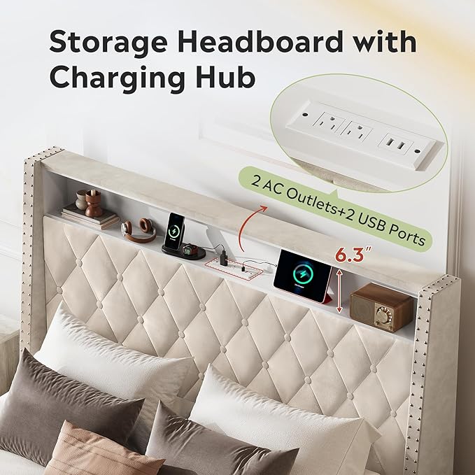 - 【Headboard Storage Shelf with Multi-Port Charging】 The headboard features a single storage shelf perfect for glasses, phones, and remotes. It comes equipped with 2 USB ports and 2 AC outlets allowing convenient fast charging of multiple devices.