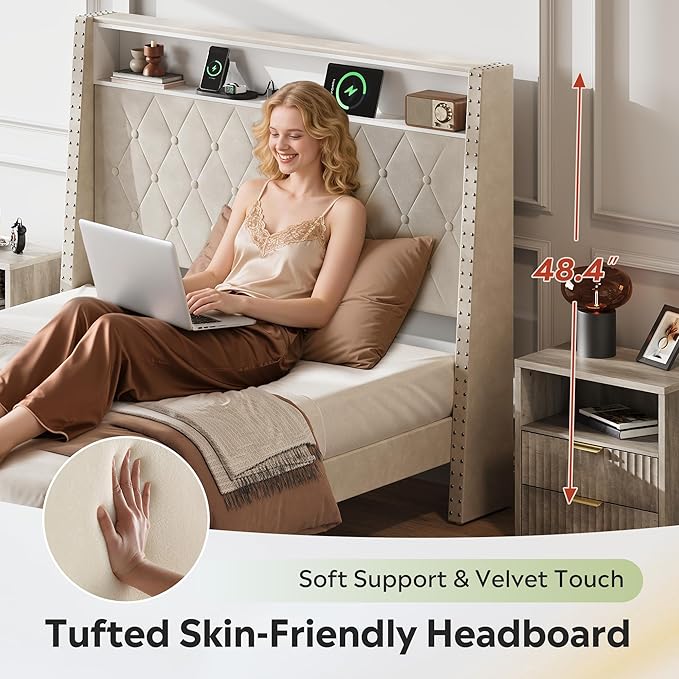- 【Headboard Storage Shelf with Multi-Port Charging】 The headboard features a single storage shelf perfect for glasses, phones, and remotes. It comes equipped with 2 USB ports and 2 AC outlets allowing convenient fast charging of multiple devices.